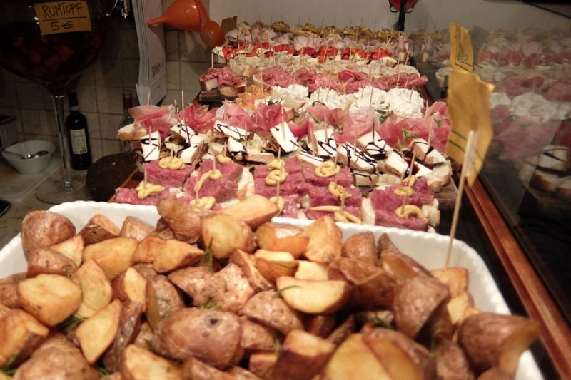 L’offerta al banco è composta prevalentemente da crostini saporiti e fantasiosi, che vanno dal baccalà ad affettati e formaggi ricercati con salse di tartufo, patè di fegato o fichi maturi, al democratico prezzo di 1 euro ciascuno.
